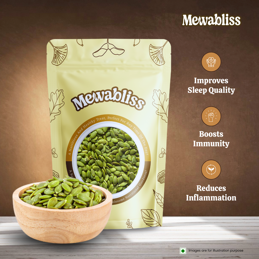 MewaBliss Pumpkin Seeds are a powerhouse of plant-based protein, magnesium, zinc, and antioxidants. Regular consumption supports better sleep, boosts immunity, enhances heart health, and contributes to stronger bones and muscles.